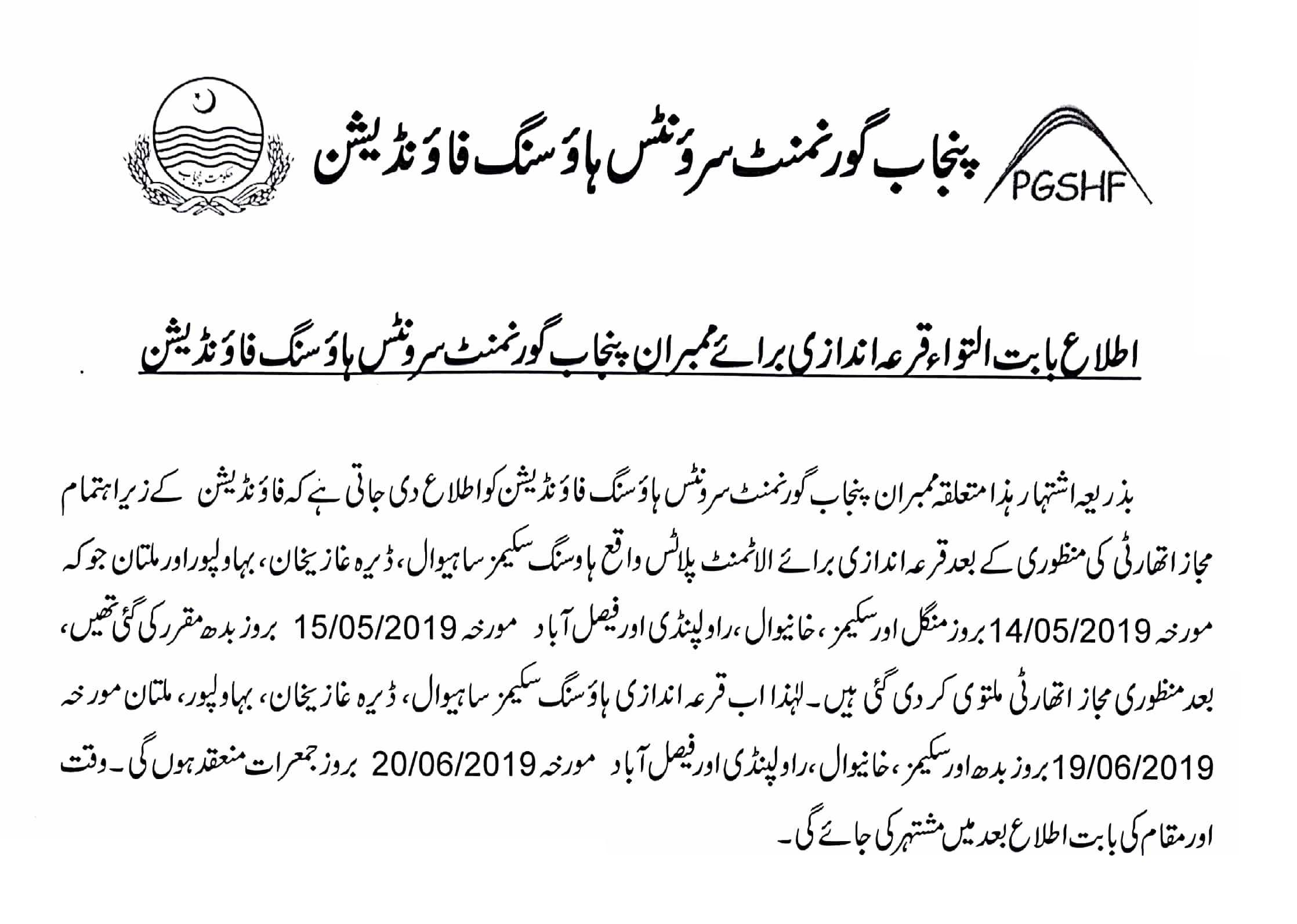 A draw ceremony for allocation of plots of PGSH Scheme, D. G. Khan was held on 02.04.2015 at 10:00 am in Al-Hamra Hall No.3, Shahra-e-Qaid-e-Azam Lahore, under the Chair of Additional Chief Secretary, Punjab/Chairman House Allocation Committee. For detail...