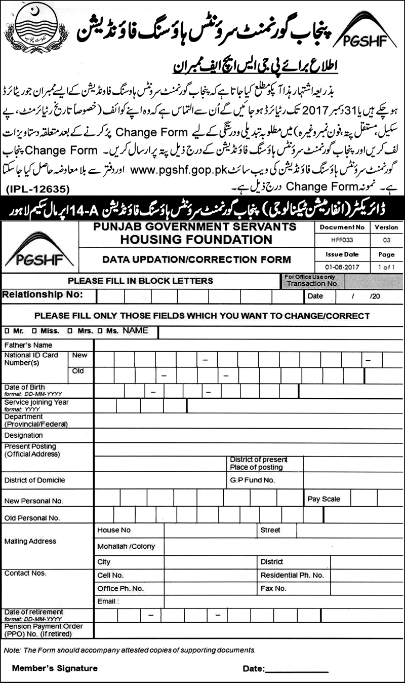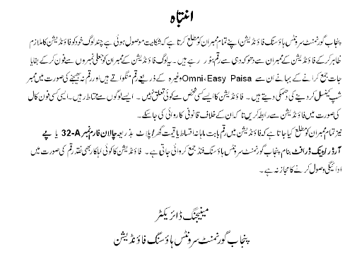Members can contribute more than this minimum amount and are advised to do so, so that there is minimum financial burden at the time of delivery of house/plot when full cost has to be paid. Retired members are also advised to continue paying through Bank Draft / Pay Order in the name of Punjab Government Servants Housing Fund.
